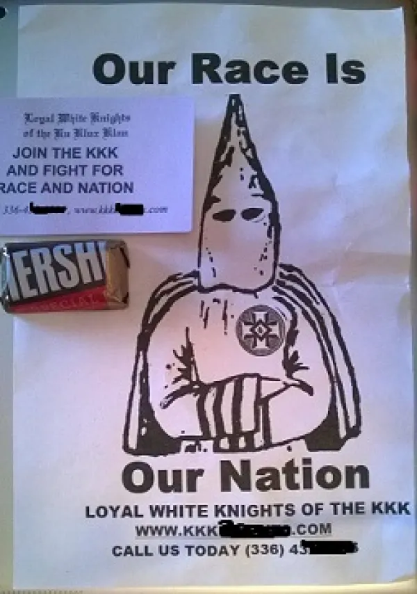 Recently flyers and business cards bearing a North Carolina phone number for the Loyal White Knights of the KKK have appeared by the thousand in single nights in Georgia, Florida, Springfield Missouri, Cookeville Tennessee, Texas, Chicago as well as Hillsboro and Lancaster in Ohio. The flyers in Texas and Lancaster, Ohio arrived with candy, presumably to entice children, while the car of a bi-racial teenager was targeted with extra flyers in Hillsboro, Ohio.