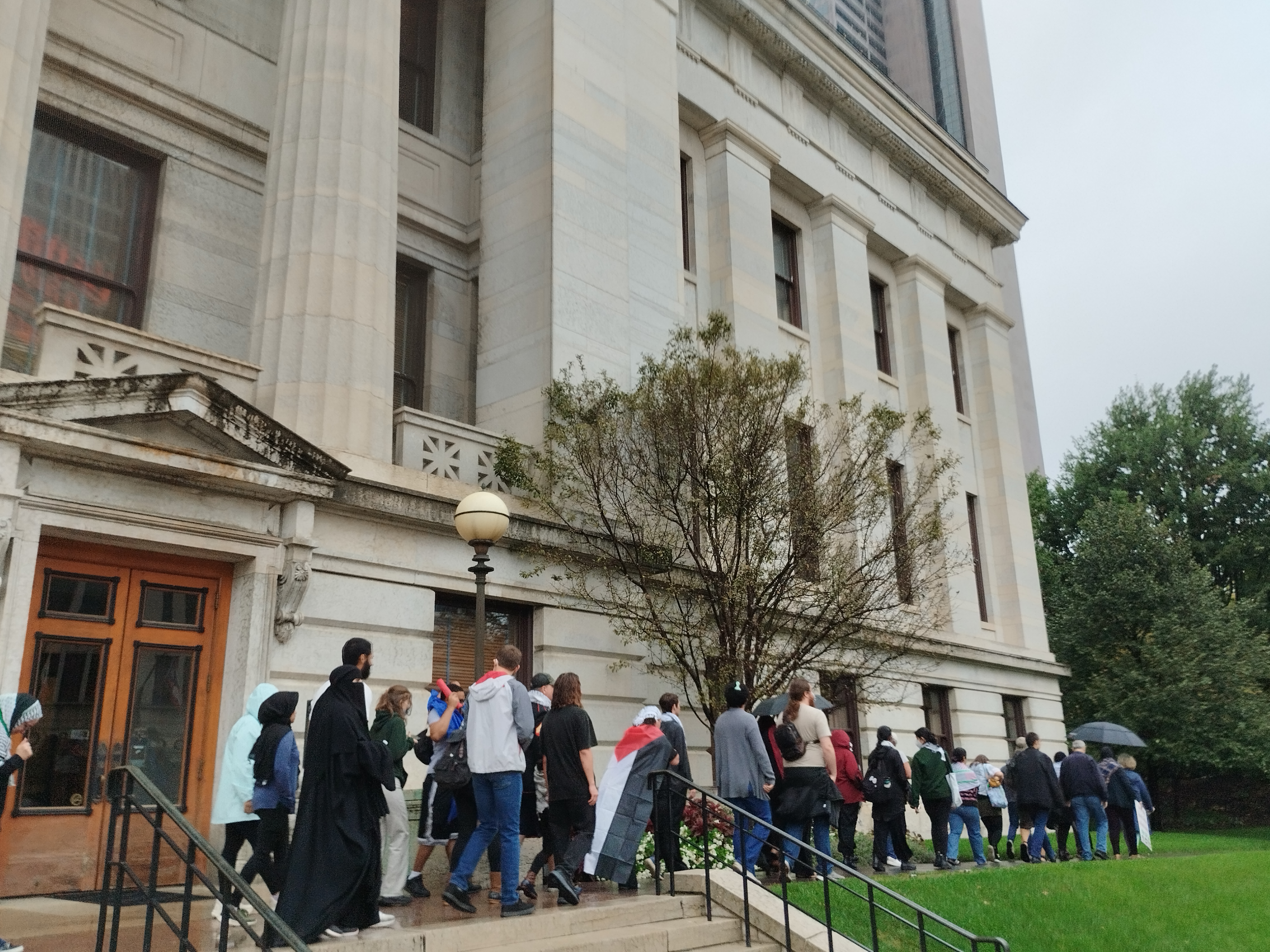 The attendees represented No New Bonds, a sprawling coalition of faith groups, labor unions, and other community organizations including Baldana, American Muslims for Palestine, Students for Justice in Palestine, Doctors Against Genocide, Veterans for Peace, Cleveland Palestine advocacy coalition, Palestine Solidarity Coalition, and the Communist Party USA. A complete list of coalition members is available at ohiodivest.org.