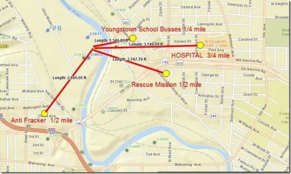 Location of the new radioactive fracking waste plant in Youngstown and its proximity to schools and hospitals