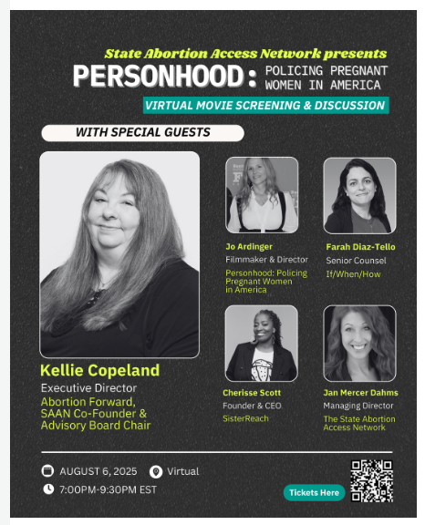 Abortion Forward Executive Director and State Abortion Access Network Co-Founder Kellie Copeland (she/her) will be featured on an upcoming screening & panel discussion of the film Personhood: Policing Pregnant Women in America this Wednesday, August 6 2025 at 7 PM.