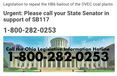 This month the Ohio Senate’s Energy and Public Utilities Committee held the second hearing for a bipartisan billthat would repeal yet another unnecessary ratepayer-funded bailout implemented by the historically corrupt HB 6. SB 117 ends the costly bailouts going to two Ohio Valley Electric Corporation (OVEC) coal plants – one called Kyger Creek, which is in Ohio and another called Clifty Creek, which is in Indiana. For anyone who needs a visual aid of how Ohio is different from Indiana, I recommend looking at a map and checking it out, especially if you’re a Republican state legislator.