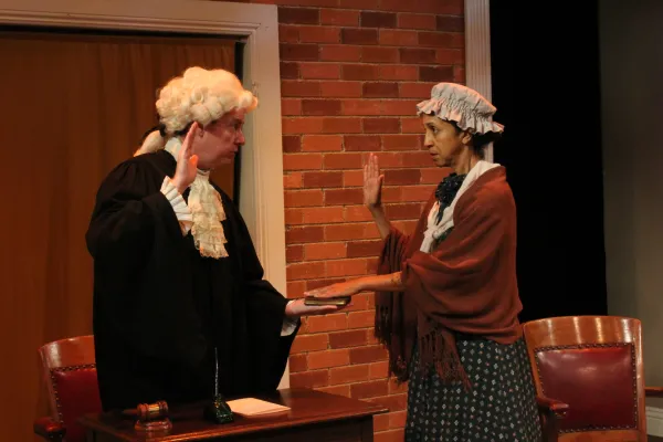 Bet lobbies Sedgwick, a Continental Congress delegate and, as mentioned, a lawyer, to represent her in court, in an effort to gain her freedom from Bet’s “owner,” Col. Ahsley, who is his friend. Finally, at the cost of their friendship, the conflicted Sedgwick rises to the historical occasion and takes Bet’s case, one of America’s early so-called “freedom suits,” setting the stage (literally) for the clash of two courthouse gladiators. During a brief intermission, the stage’s domestic set is rearranged to become a courtroom, and as the proverbial curtain lifts on Act II, the legal battle of the titans, that is the dramatic highlight of this play, commences.