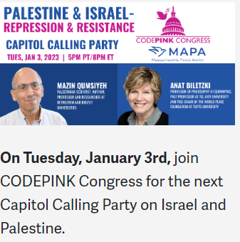 This new ultra-nationalist government stands in explicit – no longer implicit – opposition to a Palestinian state and threatens to strip the courts of their power. US Secretary of State Blinken insists the US commitment to apartheid Israel is ironclad, despite whispers last month the Biden administration might refuse to meet with some of the most reactionary members of the new Israeli government. Join us as we detail the situation on the ground in Palestine and examine US congressional and grassroots efforts to end US complicity in Israeli crimes.