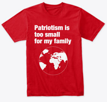 Please take your good patriotism or proper nationalism and stick it where you’ve stuck homophobia and ageism and religious bigotry. Don’t you love your family? Your neighborhood? Your town? Your region? Of course you do, but where are the flags and songs and weapons parades to prove it? You don’t need them, do you? Because you don’t need to be conditioned to support mass murder on behalf of your family, neighborhood, town, or region.