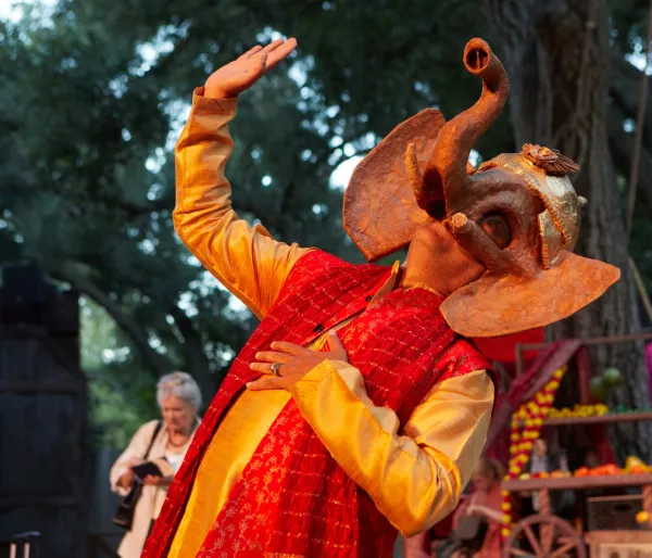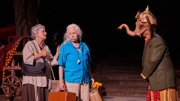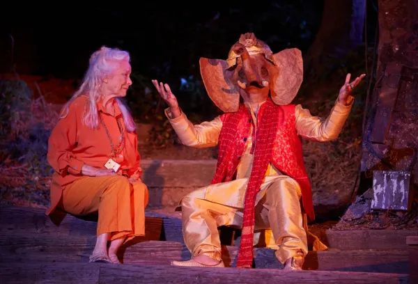 Will Geer’s Theatricum Botanicum goes Bollywood, with Terrence McNally’s India-set A Perfect Ganesh, which opens with a barefoot Apsara (Shivani Thakkar) or celestial nymph in Hindu mythology, traditionally dancing onstage in age-old Indian radiant raiment. The dancer is followed by Ganesha (Mueen Jahan), the narrator wearing an elephant mask, denoting the Hindu god Ganesh, the remover of obstacles, bearer of good luck and patron of arts.