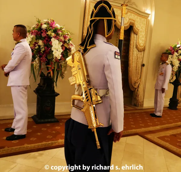 A royal guard, armed with a gold-plated assault rifle, stands inside the Boromrajasathitmaholarn Hall of the Grand Palace. Thailand enforces Criminal Code Section 112, which makes it illegal to "defame, insult, or threaten members of the royal family." photo credit: Photo copyright Richard S. Ehrlich
