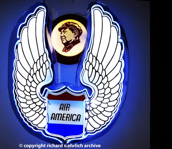 A badge of China's Mao Zedong -- recently juxtaposed by someone with a sense of symbols -- and an antique Air America neon logo from when the CIA-owned airline was at war against Laos. photo credit: Photo copyright Richard S. Ehrlich