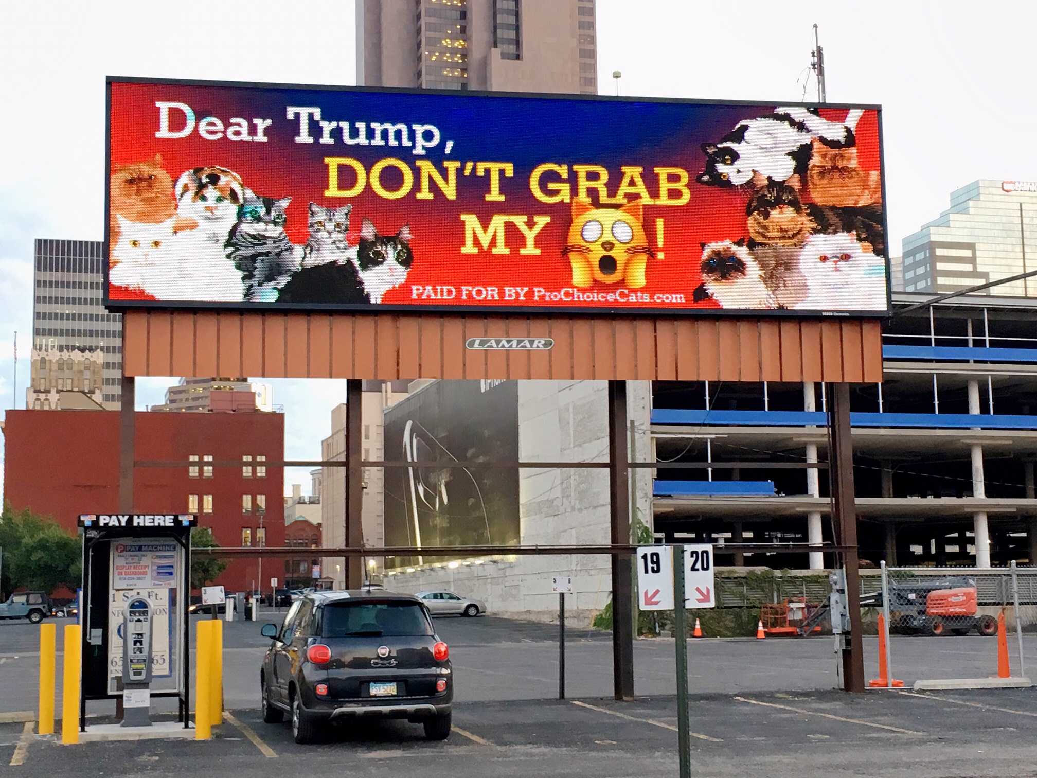 Amanda Patton, owner of prochoicecats.com, saw an opportunity to poke a little fun at Trump and send a message at the same time. That message can now be seen on billboards in downtown Columbus. “We all saw the video of Trump bragging about how he ‘grabs’ women ‘by the pussy’ and it became crystal clear that Trump’s disdain for women’s rights, bodily autonomy and pussies intersect in a horrifyingly organic way,” she says. A cat lover and enthusiastic champion of reproductive rights, Patton brought her two passions together to form Pro Choice Cats. The group advocates for reproductive rights and access in Central Ohio, and last year raised funds to purchase billboards downtown promoting pro-choice messages.