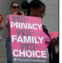 Black woman at rally holding a sign that says Pro privacy, pro family, pro choice