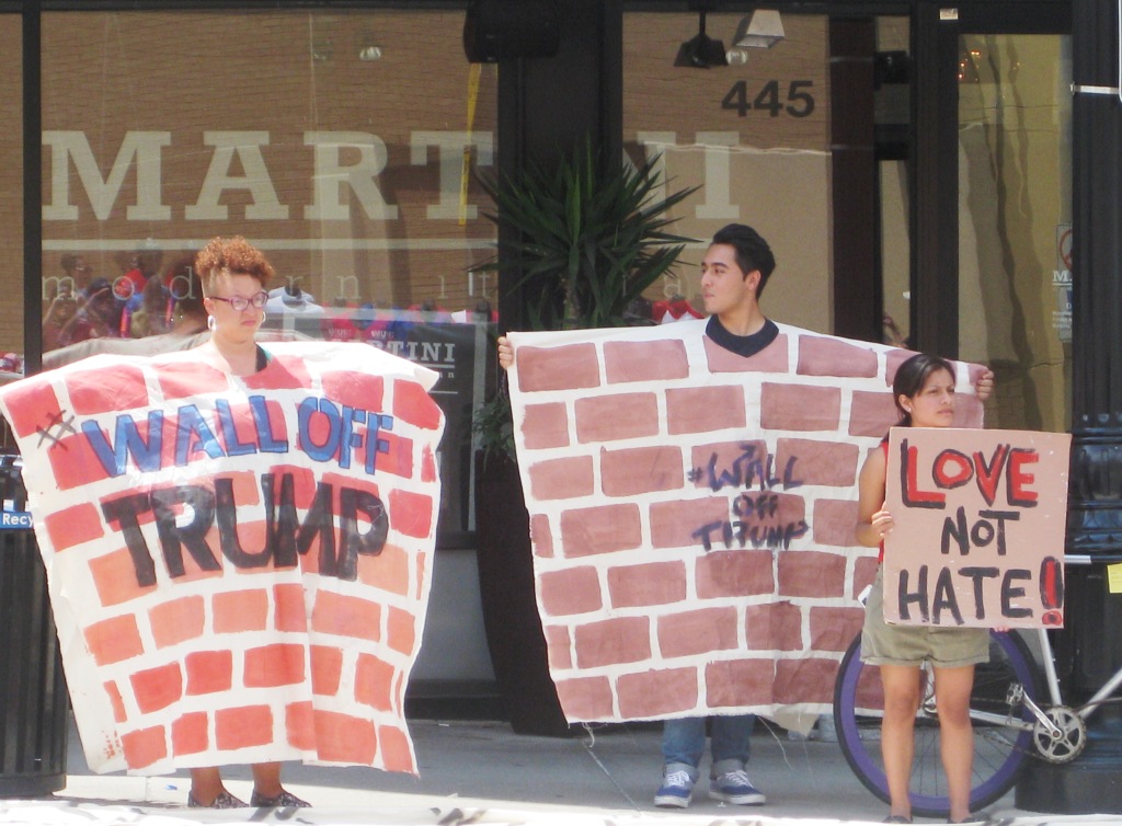 One merchandise hawker tried to turn the setback into an opportunity. “$5 off all Trump gear if you couldn’t get in!” he shouted over a bullhorn. Then he started to heckle protesters across the street who held signs saying “Wall off Trump,” “Love Not Hate,” “Black Lives Matter,” and “No Más Trump.”