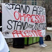 A big sign on a sheet saying Stand Against Oppression Stand for Justice for Palestine
