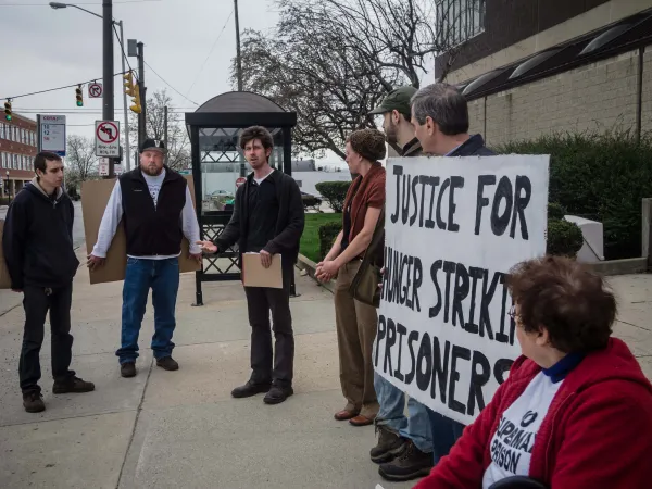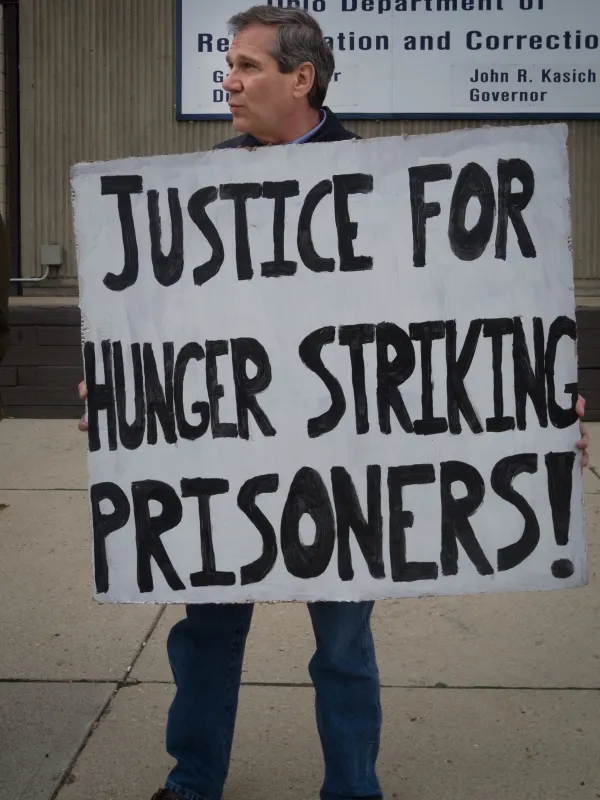 Supporters of the hunger strike in the supermax unit at Ohio State Penitentiary rallied in Columbus Tuesday, April 14, calling upon prisons director Gary Mohr to order the restoration of the inmates' constitutionally protected recreation and religious rights.  Those rights had been taken away as collective punishment for the misdeeds of one prisoner.
