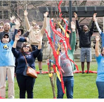 Lots of people outside with hands raised up and colorful streamers falling around