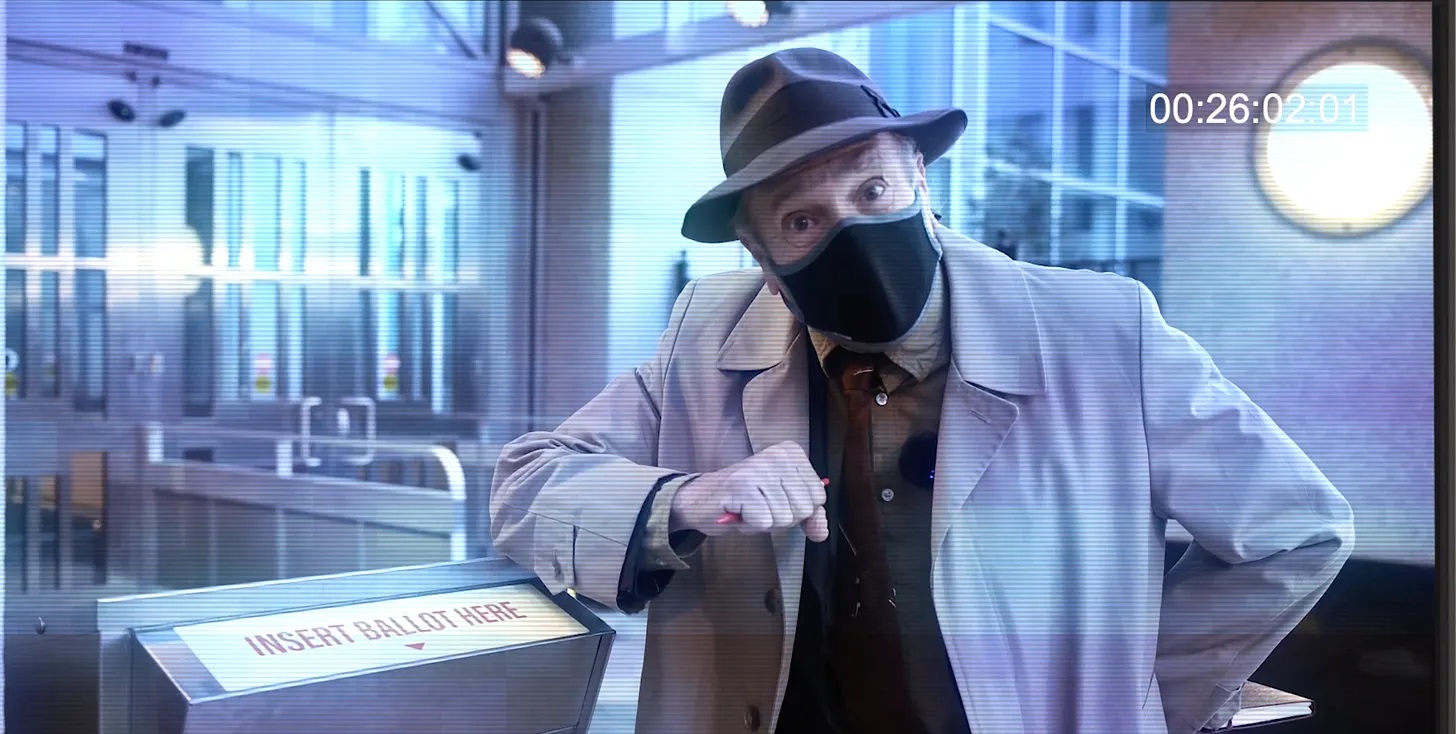 Surveillance footage of a drop box in Atlanta, used in the film 2000 Mules as evidence of a “mule” whom filmmaker Dinesh D’Souza claimed was paid to stuff this and 26 other ballot boxes. According to D’Souza, this was “the smoking gun! O.J. Simpson…leaving the scene of a crime!” But it doesn’t show anything more than a Black man voting.