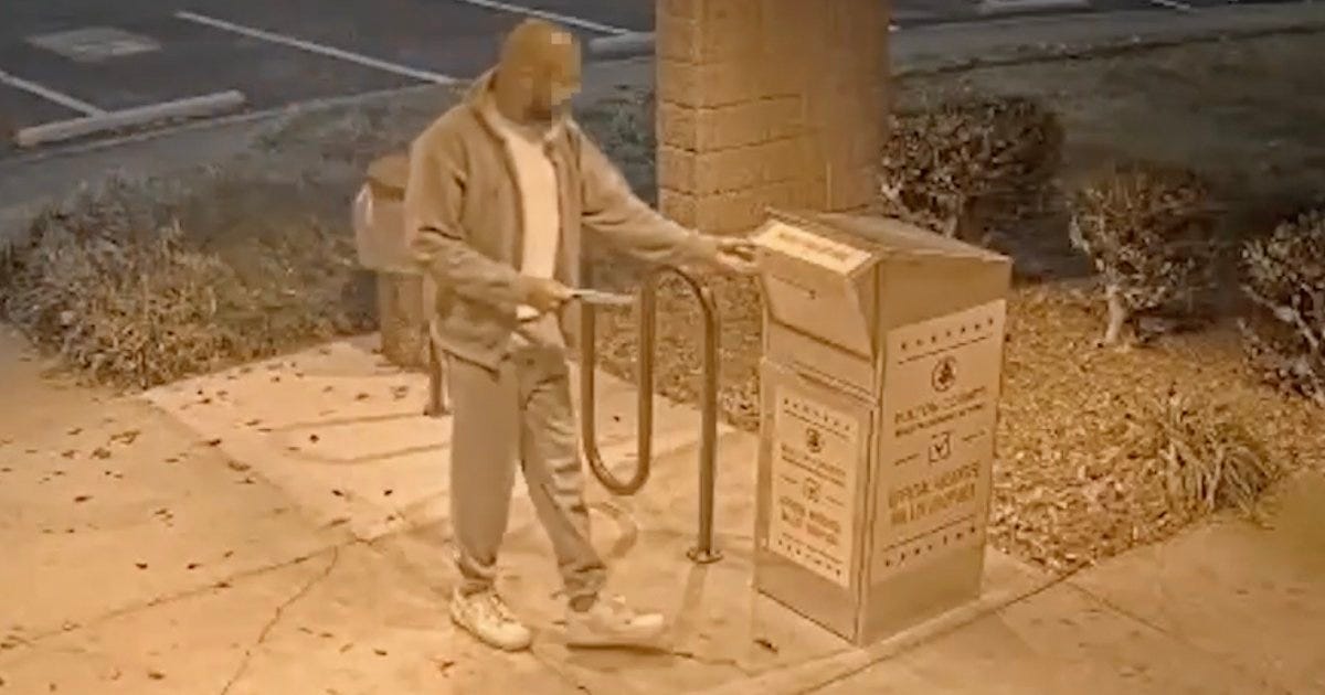 Surveillance footage of a drop box in Atlanta, used in the film 2000 Mules as evidence of a “mule” whom filmmaker Dinesh D’Souza claimed was paid to stuff this and 26 other ballot boxes. According to D’Souza, this was “the smoking gun! O.J. Simpson…leaving the scene of a crime!” But it doesn’t show anything more than a Black man voting.Follow me on this.