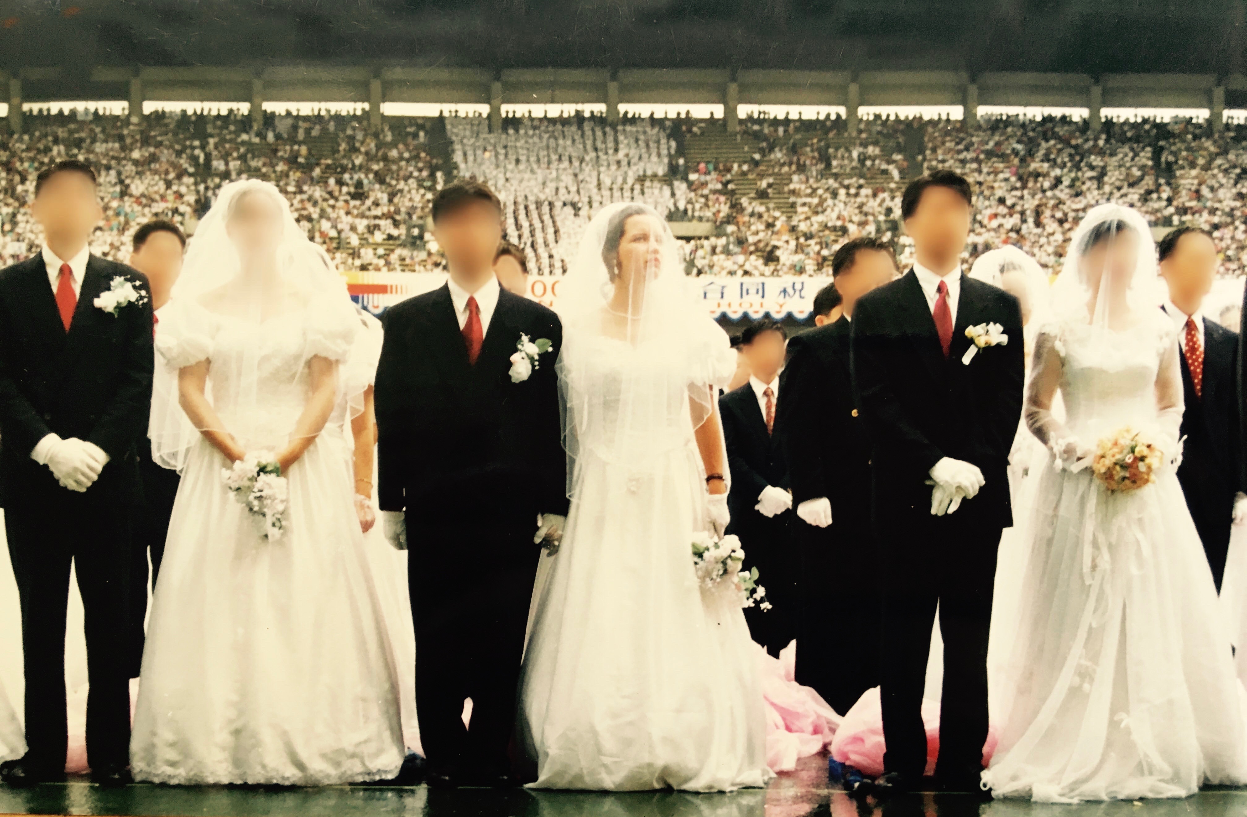 Cara Jones (center) is married in one of the Unification Church’s typical mass weddings. Her marriage later ended in divorce.