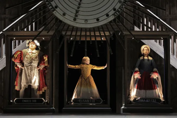 And with its stellar stagecraft I do indeed heartily recommend that opera goers see, hear and enjoy Roberto. The optical opulence of Belgian Benoît Dugardyn’s scenery evokes 16th century London, as the designer puts his architectural background to good use, creating a set reminiscent of Shakespeare’s Globe Theater (the Bard himself makes a cameo appearance onstage). Without revealing details, the first and last scenes visually express Elizabeth’s angst, caused by having the institution of the monarchy thrust upon her. As Shakespeare observed in another meditation on monarchy, Henry IV: “Uneasy lies the head that wears the crown” - and heavy is the heart that must bear it. Not to mention the multitude of subjects who must suffer under a ruling class that inherits privilege and power to reign - along with the megalomania and affluenza in exercising their royal rule.
