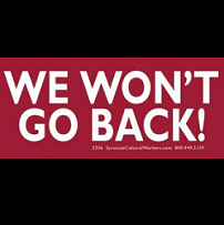 Black background, thick red stripe in the middle and white letters reading We Won't Go Back!