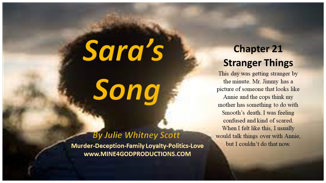 This day was getting stranger by the minute. Mr. Jimmy has a picture of someone that looks like Annie and the cops think my mother has something to do with Smooth’s death. I was feeling confused and kind of scared. When I felt like this, I usually would talk things over with Annie, but I couldn’t do that now. The only person that I could talk to about this was Jean and she was still at school. It was almost time for school to get out so there was nothing that I could do but wait.