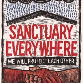 Drawing of two hands holding each other by the wrist and the words Sanctuary Everywhere we will protect each other