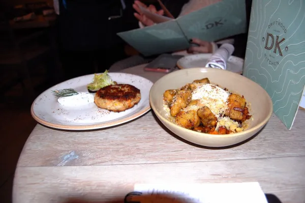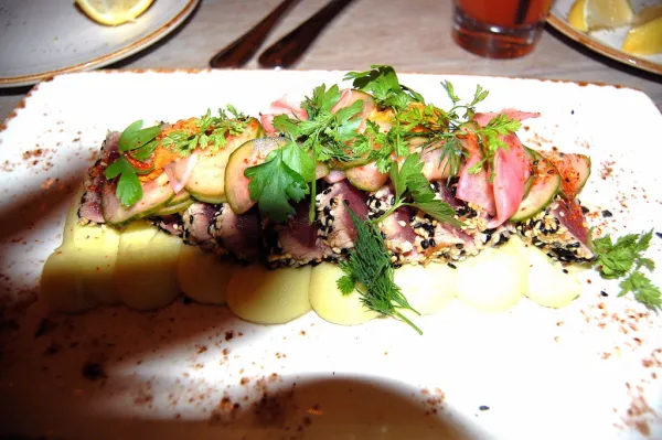 Hungered by my hillside hike I ordered another appetizer - delectable carmelized butternut squash gnocchi with sage brown butter and ricotta, which Sara sagely suggested. It was simply stellar, and although Driftwood Kitchen does serve steaks, I decided to stick with the nautical theme. Biting down on ahi tuna was an “aha moment!”, providing a culinary satori. Atop mashed potatoes puree, with wasabi, cucumber and radish salad and Santa Barbara uni ponzu sauce, the pink, soft, seared raw tuna awakened this succulent seer’s taste buds. Another savory treat plucked from Neptune’s treasure is lobster spaghetti carbonara “rustichella d’abrazzo” topped by a sunny side up egg with guanciale grated pecorino romano and tarragon.
