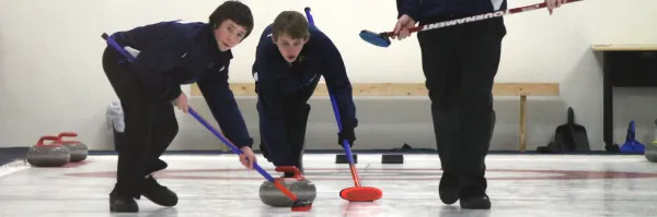 Two local boys participate in a youth event at the Columbus Curling Club.