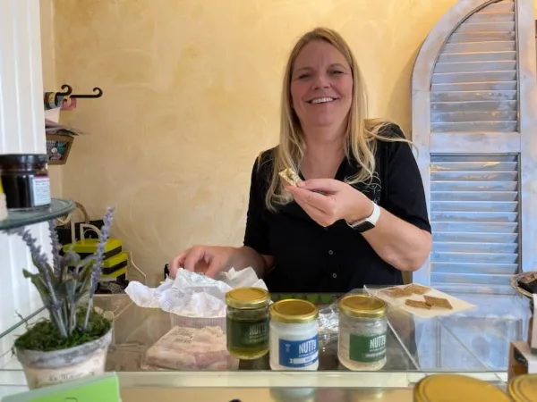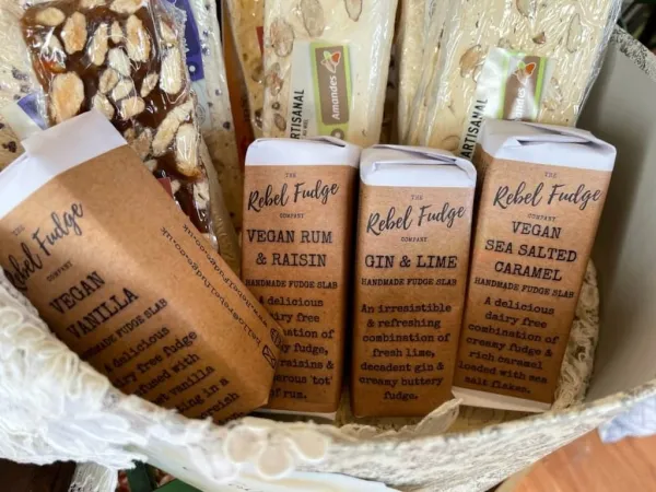 Other treats include: handcrafted French macaroons and other pastries (non-vegan, but some are dairy-free and gluten-free); fudge (both non-vegan and three vegan options which are vanilla, rum raisin, and salted-caramel; a cashew nut-based vegan craft cheeze brand from Spain with seven uncommon flavors in the US/vegan market to choose from including bleu cheeze, pimento, onion, white, quince, truffle, and blueberry; as well as delicious pumpkin-based vegan jerky, vegan mayo, vegan pesto, and an herb spread by the same company.