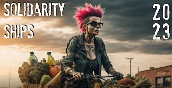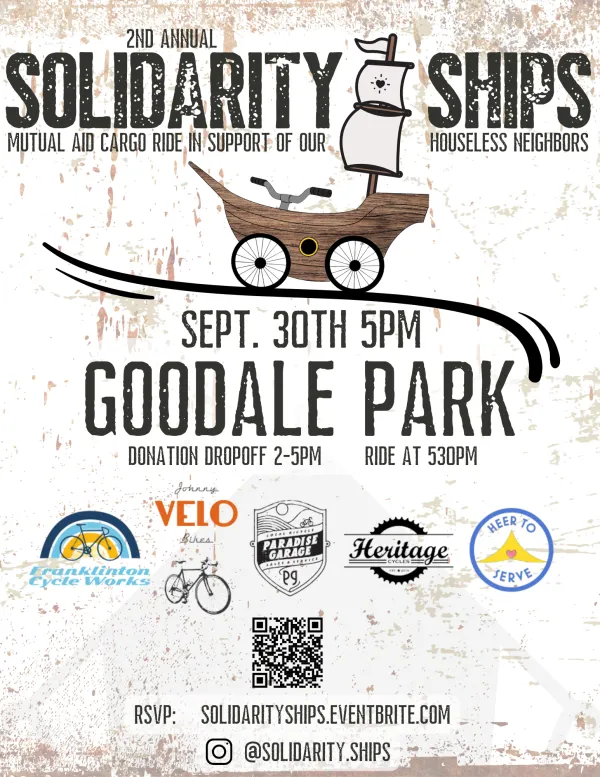 Long-time committed community organizer and activist Liz Andromeda will host Solidarity Ships on September 30, 2023 at Goodale Park. All are invited to ride with or donate supplies for us to carry, in an adventure of solidarity, community, and camaraderie.