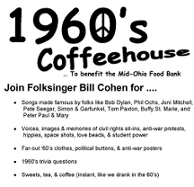 This is the 33rd year of sixties coffeehouses for Bill. He’s performed this show more than a hundred times now at colleges, churches, synagogues, conferences, high schools, and middle schools across Ohio and beyond.