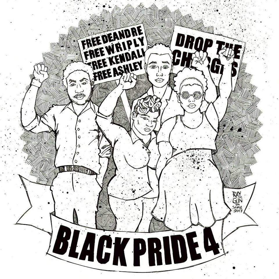 Black and white drawing of four black activists and signs that say Drop the Charges and BlackPride4