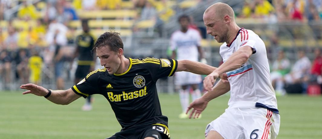 Ethan Finlay battles against the Chicago Fire’s Eric Gehrig. Photo courtesy of the Columbus Crew