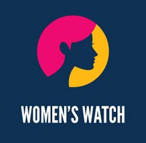 Drawing of side view of woman's head in a circle with red hair and yellow on other side of blue head silhouette with words women's watch