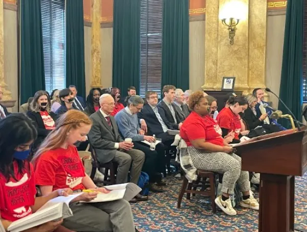 On January 29, the Ohio Student Association protested at Senate Bill 1’s first and only proponent testimony hearing, sitting silently for the hearing’s two hour duration carefully reading copies of Senate Bill 1 before marching out with a chant of “Higher ed will be dead.” Student protesters present in the hearing room far outnumbered the proponents.