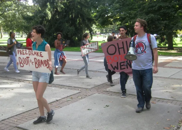 The deadline for Ohio to renew its contract with Wendy’s is approaching. At Bricker Hall, SFA members delivered a letter to OSU president Michael Drake, reminding him about the university’s commitment to terminate the contract. “Drake, keep your promises!” the demonstrators chanted. President Drake was not available, but a staff member promised that he would get the letter.