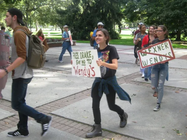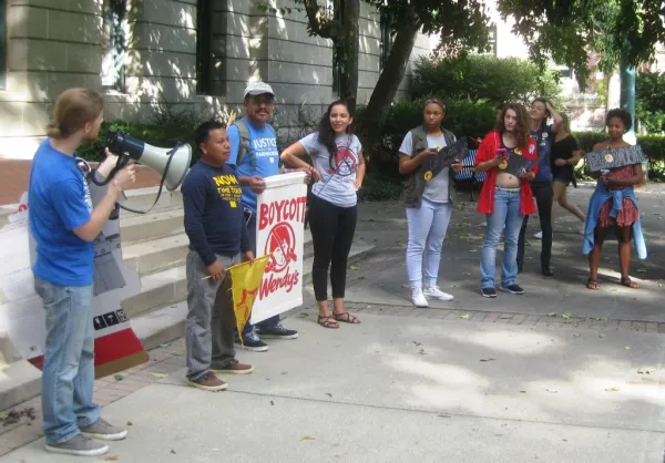 On October 7 members and supporters of the Student/Farmworker Alliance (SFA) held a rally outside Bricker Hall at the Ohio State University, calling on the administration to terminate its contract with the Wendy’s Corporation. The fast food chain has lucrative contracts with universities across the country. Wendy’s operates a restaurant in the Wexner Medical Center at OSU.