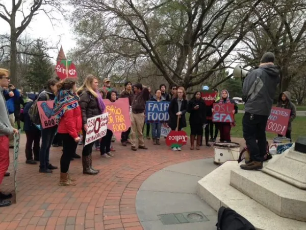 In response, Ohio State SFA quickly mobilized students to gather on the Oval, march to the Wendy’s location, and deliver the message there. When the manager on duty refused to accept the letter -- as they are instructed to do from Wendy’s corporate -- the crowd of 50 began chanting “Up Up with the Fair Food Nation! Down Down with the exploitation!”.