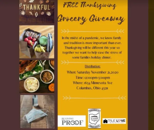 Free Thanksgiving Grocery Giveaway – Saturday, November 21, 12-3pm, 1634 Minnesota Ave., Columbus, 43211. In the midst of a pandemic, we know family and tradition are more important than ever. Thanksgiving will be different this year, so together we want to help ease the stress of some family’s holiday dinner.