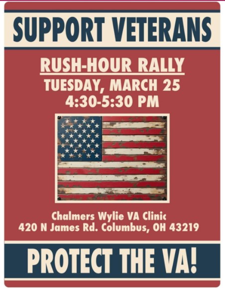 Join our Rush-Hour Resistance Rally to protest the cuts to the VA and support veterans! The Chalmers Care Center, serving veterans from a wide area, is on James Road just south of the Columbus Airport. Thousands of cars pass this location during rush hour every weekday afternoon, making this the perfect place to inform people about the crippling cuts that Trump, Musk and DOGE are making to our federal government.