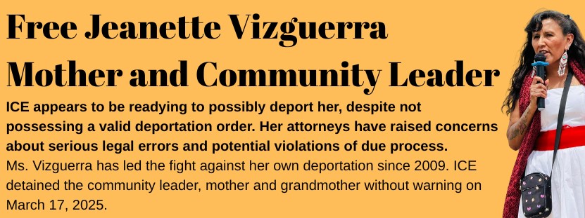She has organized and supported immigrant and human rights for years, she needs our support now.Sign and share the petition to free Jeanette:https://secure.afsc.org/a/freejeanetteDonate to the family’s GoFundMe to cover legal costs:https://gofund.me/5cb78117College Students/Faculty/Staff: Sign