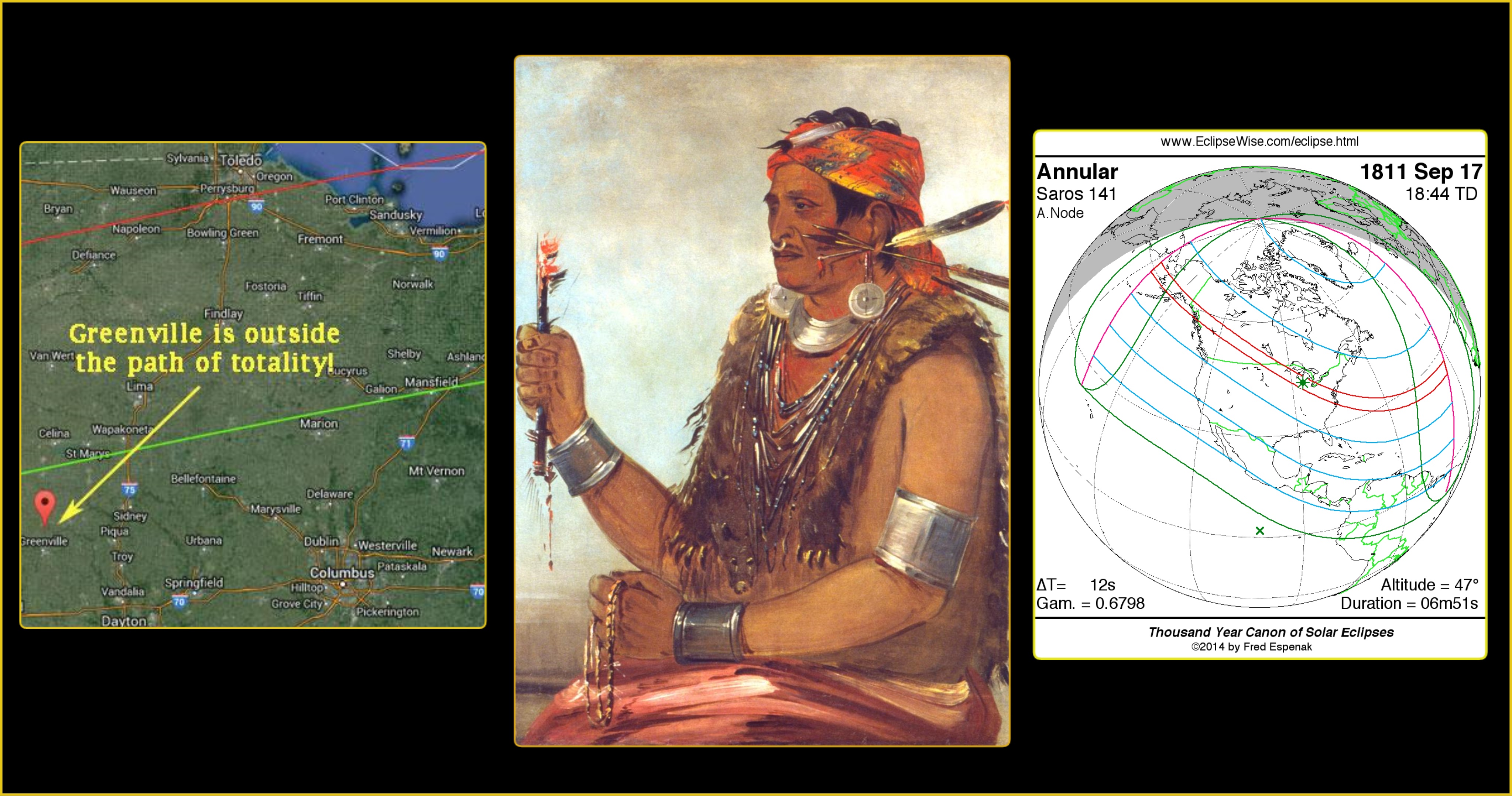 It’s a safe bet that Tecumseh learned of the coming 1806 eclipse from the Old Farmer’s Almanac, and then told his brother, with the intent of building the kind of religious movement needed to bring tribes into alliance for a rebellion. Of course, the eclipse predictions of the 1790s and 1800s were not very accurate as to path of visibility. That the path missed Greenville supports that the “prophecy” came from the almanac.