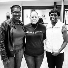 Black and white photo of three women, two black and one Latina smiling at the camera