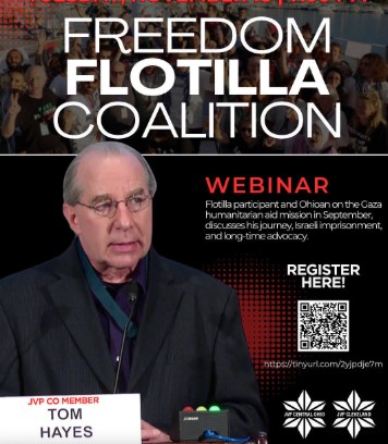 Jewish Voice for Peace event - Tom Hayes will reflect on his experiences as a participant in the Gaza humanitarian aid mission in late September. Following his kidnapping and imprisonment in Israel, Tom returned to his home in Columbus on October 12.