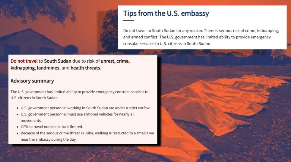 According to the U.S. State Department, Americans should not travel to South Sudan for any reason because it’s full of, “carjackings, shootings, ambushes, assaults, robberies, and kidnappings” and, “foreign nationals have been the victims of rape, sexual assault, armed robberies, and other violent crimes.” And if you do go, they urge to make sure you have your will written.