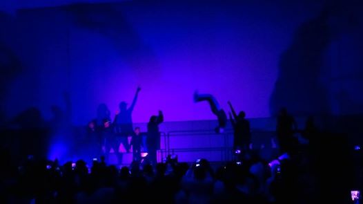 Silhouettes of people dancing and flipping in the air against a bright blue background on a stage in front of an audience