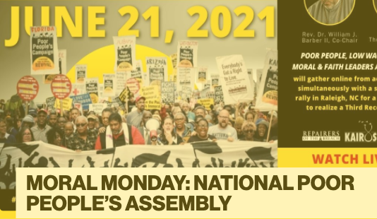 Monday, June 21, 2021, 5:30 PM.  National Poor People’s Assembly - 3rd Reconstruction.  Poor people, low wage workers, moral and faith leaders and advocates will gather online from across the nation simultaneously with a socially distant rally in Raleigh, NC at the state legislature for a mass assembly.  The hybrid online/in-person National Poor People’s and Low-Wage Workers' Assembly will raise a chorus of voices demanding a moral revolution that puts the suffering of the 140 million+ and low-income people in the U.S. at the center of every policy debate.  More information and registration here