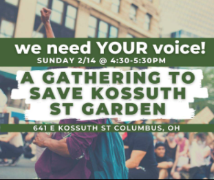 Join the Kossuth Street Garden and other community organizations on Sunday, February 14th as we build support in advance of a city council hearing and vote about the garden on the 22nd.