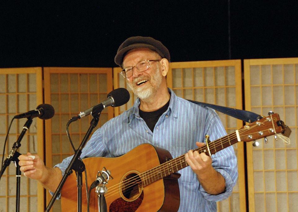 Man with gray goatee and black cap holding guitar at microphone smiling