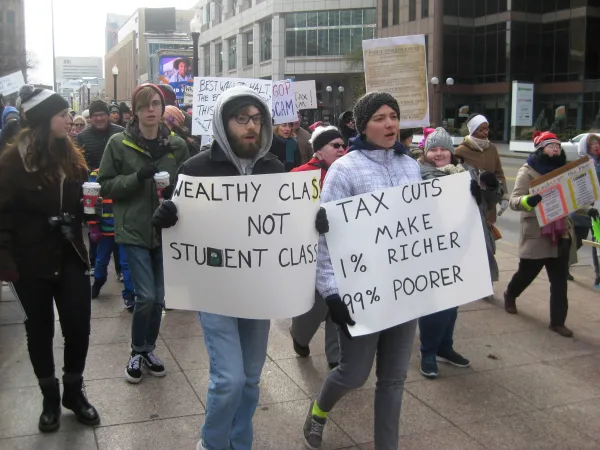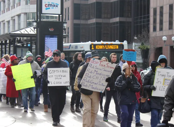 Demonstrators march to Senator Rob Portman's office on December 9 to protest the GOP tax bill.