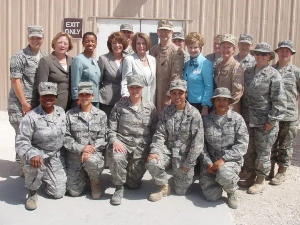 Speaker Nancy Pelosi and a Congressional Delegation in Qatar on May 8th. The Members visited the commanders and service members stationed at the Al Udeid Air Base outside of Doha. Qatar serves as a base for U.S. CENTCOM Forward Headquarters, which oversees military operations in Iraq and Afghanistan. Speaker Pelosi is joined by Susan Davis of California, Chair of the Armed Services Subcommittee on Military Personnel; Madeleine Bordallo of Guam, Member of the Armed Services Committee; Niki Tsongas of Massachusetts, Member of the Armed Services Committee; and Donna Edwards of Maryland, Member of the Science and Technology Committee. Nancy Pelosi from San Francisco, CA, CC BY 2.0 <https://creativecommons.org/licenses/by/2.0>, via Wikimedia Commons