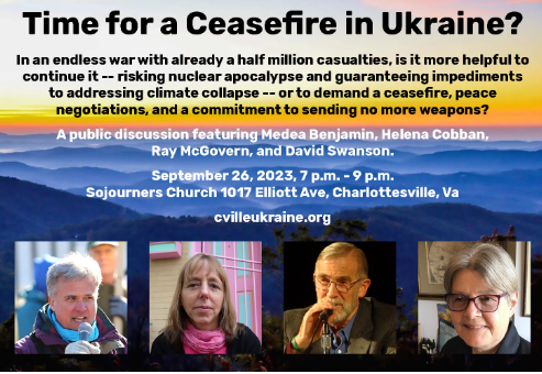 A public discussion featuring Medea Benjamin, Helena Cobban, Ray McGovern, and David Swanson.